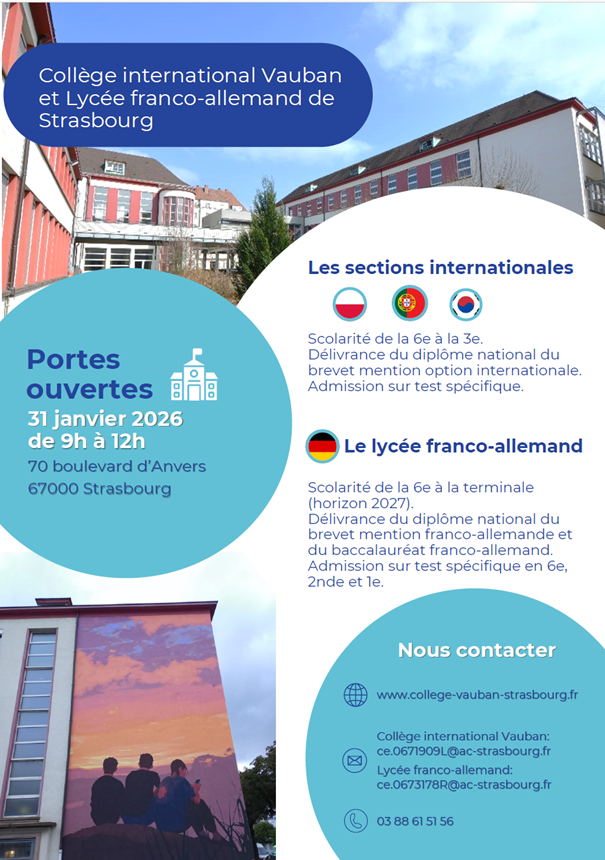 La journée des portes ouvertes sera organisée le samedi 31/01/2026 de 9h à 12h pour le collège international Vauban et le lycée franco-allemand (collège et lycée).